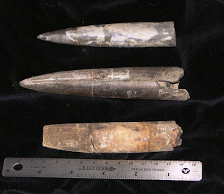 These are fossil belemnoids, Oxyteuthis tehamaensis, from the Lower Cretaceous Paskenta Formation in the northern Sacramento Valley. For those of you who don't already know, belemnoids are...fossil squid! What you see preserved here is (if I recall correctly, it's been a while) the rostrum or "rear end" of the squid; the middle one with the groove is actually the ventral surface of the animal.
